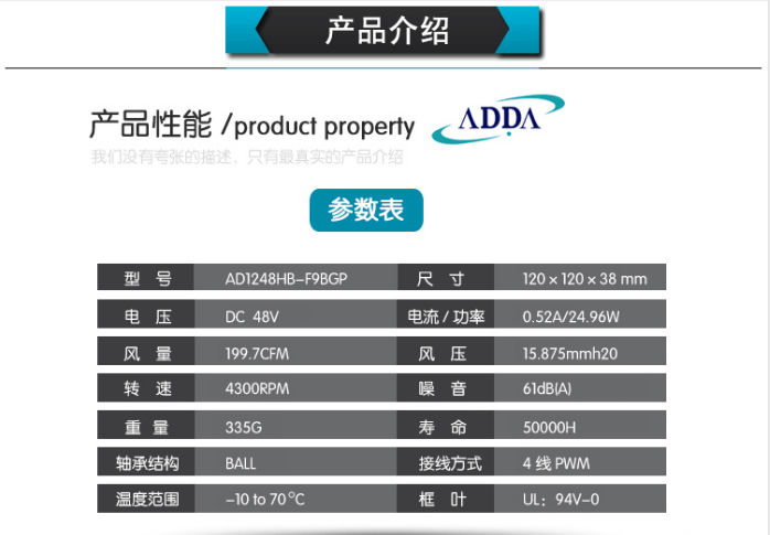 ADDA AD1248HB-F9BGP DC48V 0.52A 12CM4線PWM散熱風機