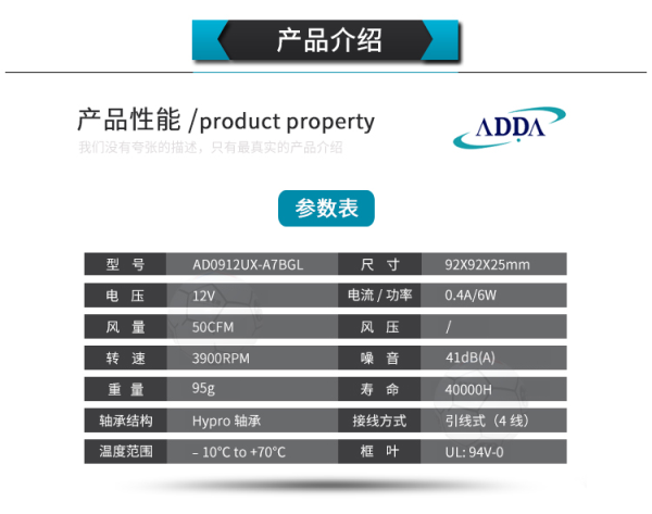 ADDA AD0912UX-A7BGL 12V 0.3A 9CM 2線風機